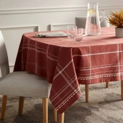 Add classic charm to your dining table with this Plaid Tablecloth from Threshold™. This rectangular decorative tablecloth features a woven plaid pattern in white on a rust background. Made from 100% cotton, it helps protect your table surface from spills, stains or scratches, and it can be machine-washed for easy care. Pair it with coordinating napkins, placemats and serveware for an aesthetically pleasing look.